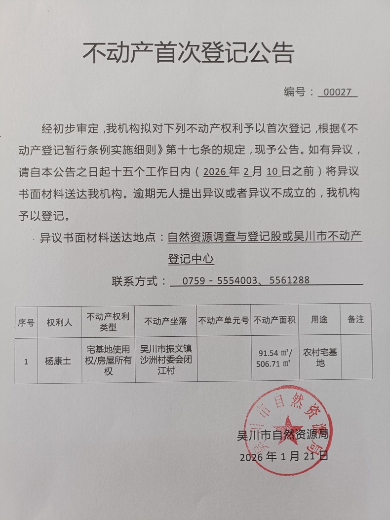 不动产首次登记公告(杨康土)宗地面积:91.54平方米、建筑面积:506.71平方米