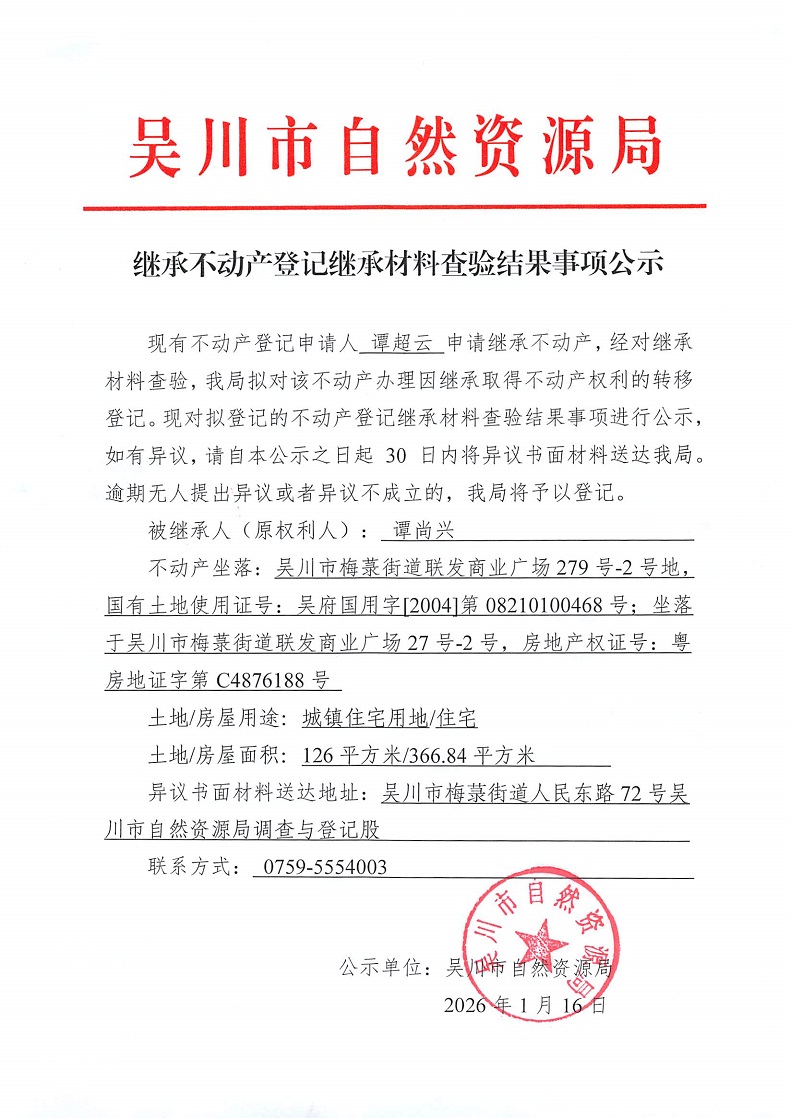 继承不动产登记继承材料查验结果事项公示(谭尚兴)