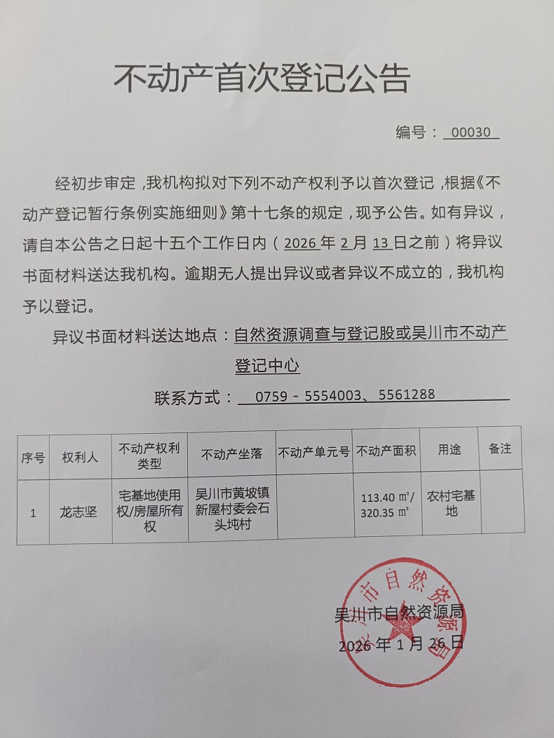不动产首次登记公告(龙志坚)宗地面积:113.40平方米、建筑面积:320.35平方米