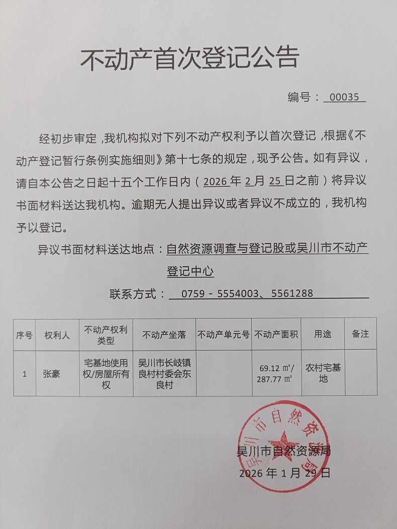 不动产首次登记公告(张豪)宗地面积:69.12平方米、建筑面积:287.77平方米