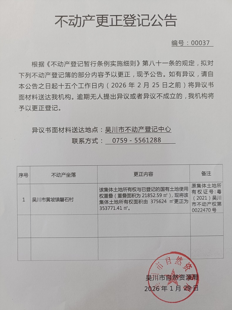 不动产更正登记公告(广东省吴川市黄坡镇磐石村马台经济合作社)宗地面积:353771.41平方米