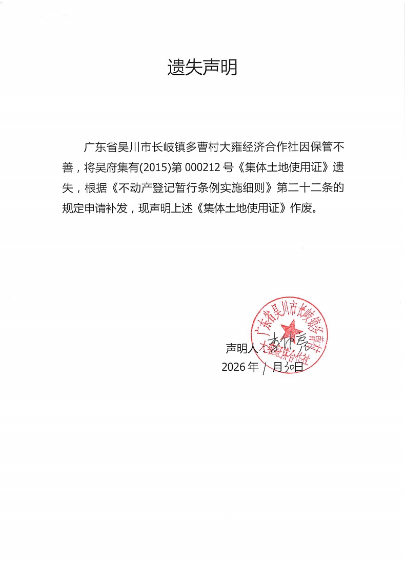 遗失声明(广东省吴川市长岐镇多曹村大雍经济合作社)