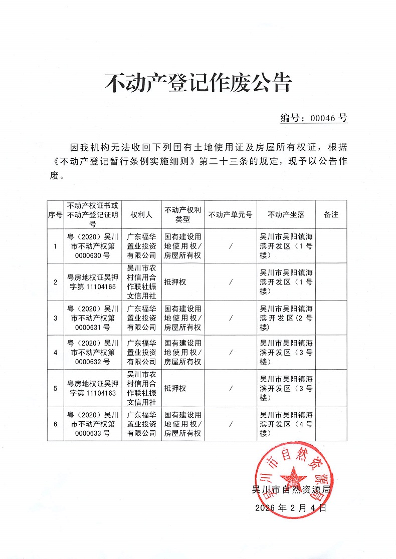 不动产登记作废公告(广东福华置业投资有限公司)
