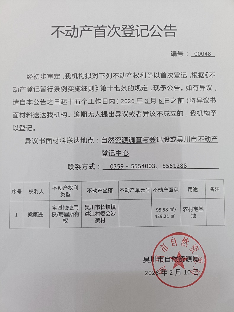 不动产首次登记公告(梁康进)宗地面积:95.58平方米、建筑面积:429.21平方米