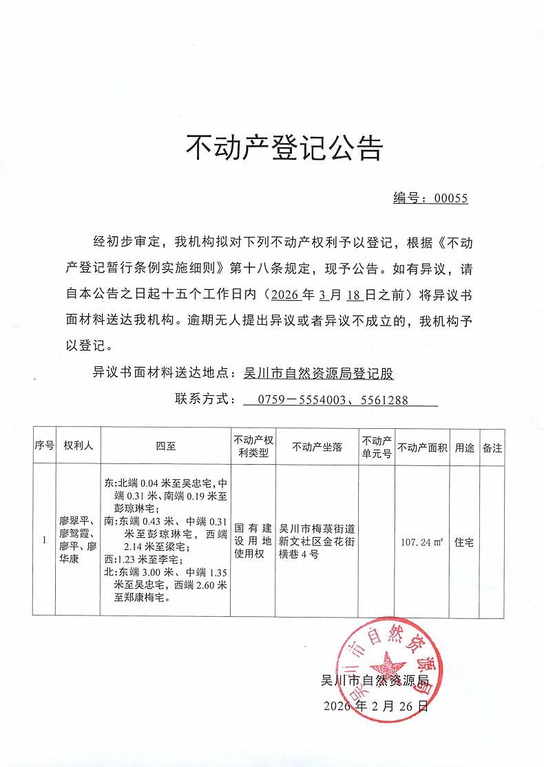 不动产登记公告(廖翠平、廖鸳霞、廖平、廖华康)