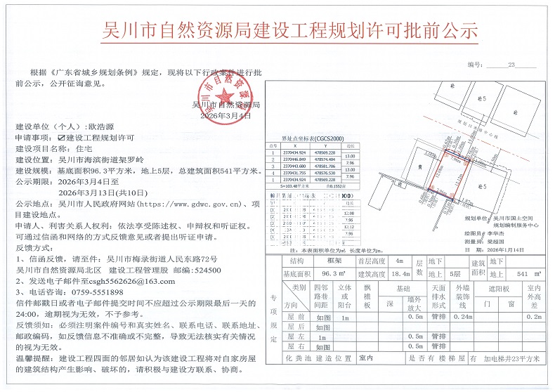吴川市自然资源局建设工程规划许可批前公示(欧浩源)