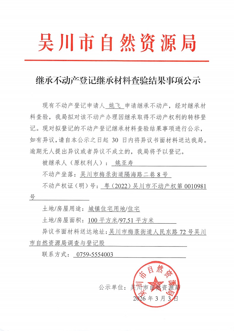 继承不动产登记继承材料查验结果事项公示(姚亚寿)