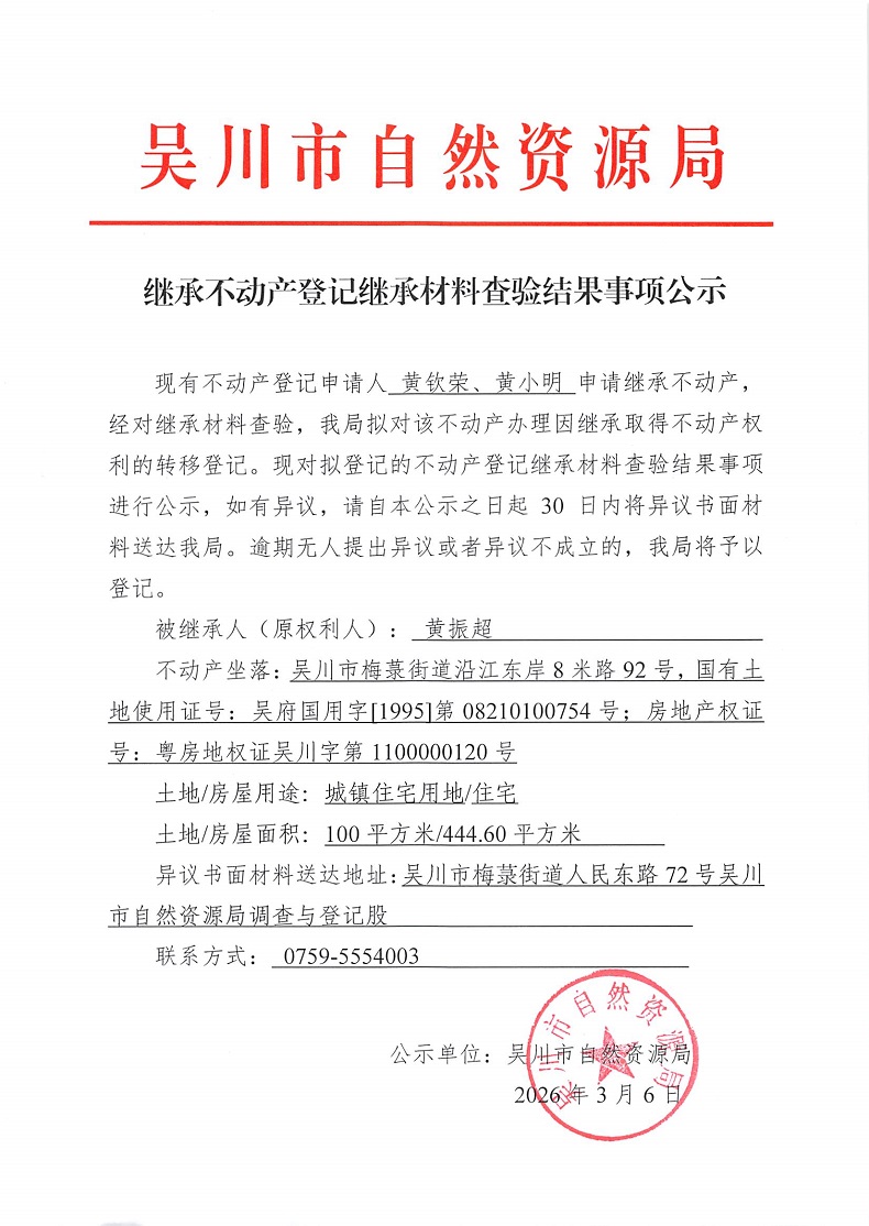 继承不动产登记继承材料查验结果事项公示(黄振超)