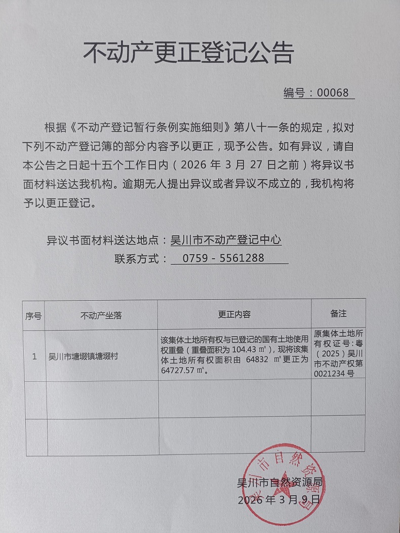 不动产更正登记公告(广东省吴川市塘㙍镇塘㙍村笋岭坡、大塘边、莲花、油麻坡、竹仔元、下圩、葵元经济合作社)宗地面积:64727.57平方米