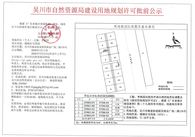 吴川市自然资源局建设用地规划许可批前公示(王勤、李桃园)