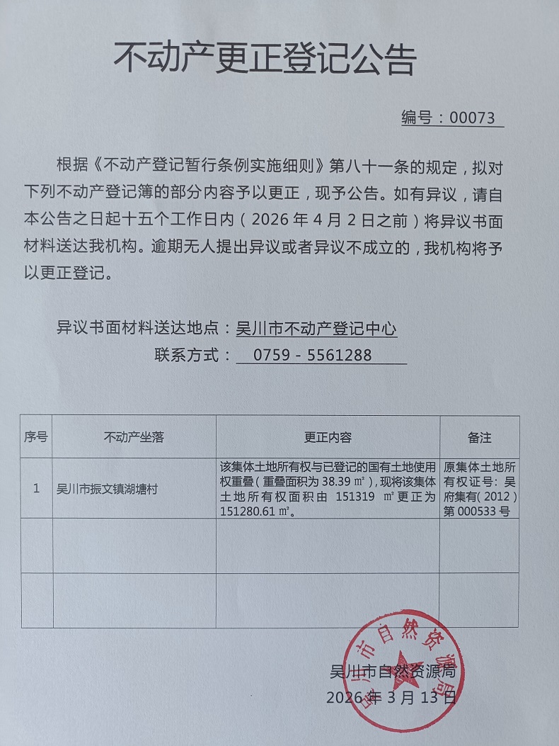 不动产更正登记公告(广东省吴川市振文镇湖塘村下林经济合作社)宗地面积:151280.61平方米