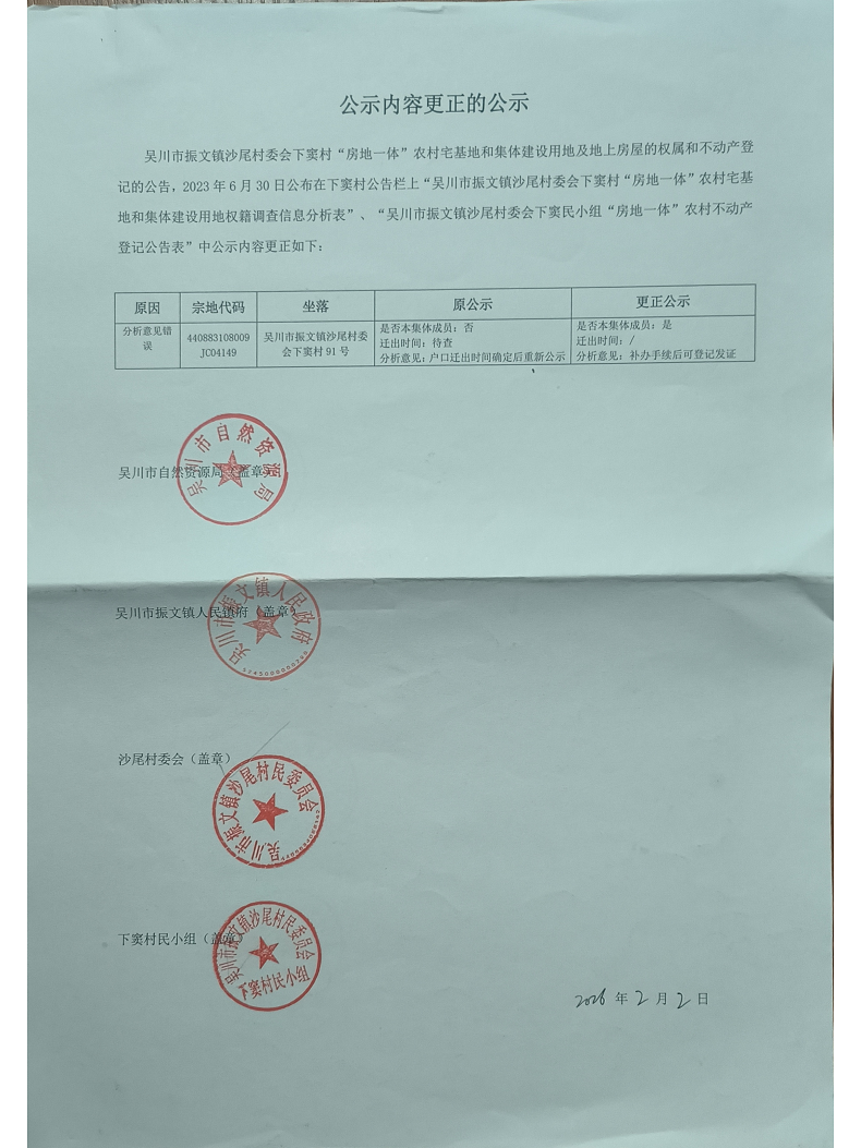 吴川市振文镇沙尾村委会下窦村公示内容更正的公示