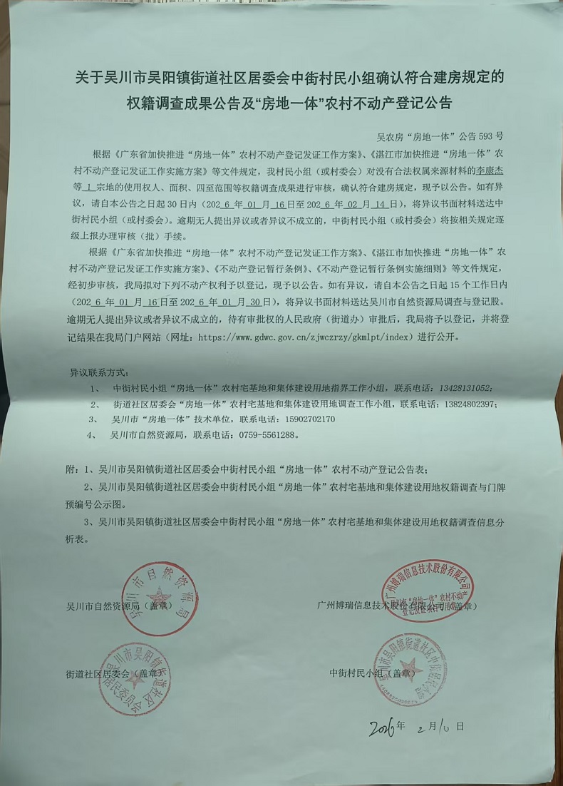 吴川市吴阳镇街道社区居委会中街村民小组确认符合建房规定的权籍调查成果公告及“房地一体”农村不动产登记公告