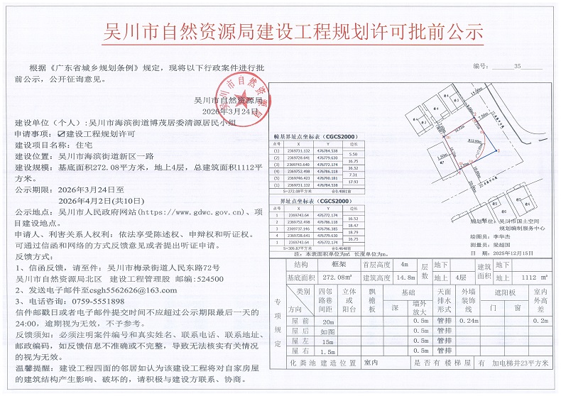 吴川市自然资源局建设工程规划许可批前公示(吴川市海滨街道博茂居委清源居民小组)