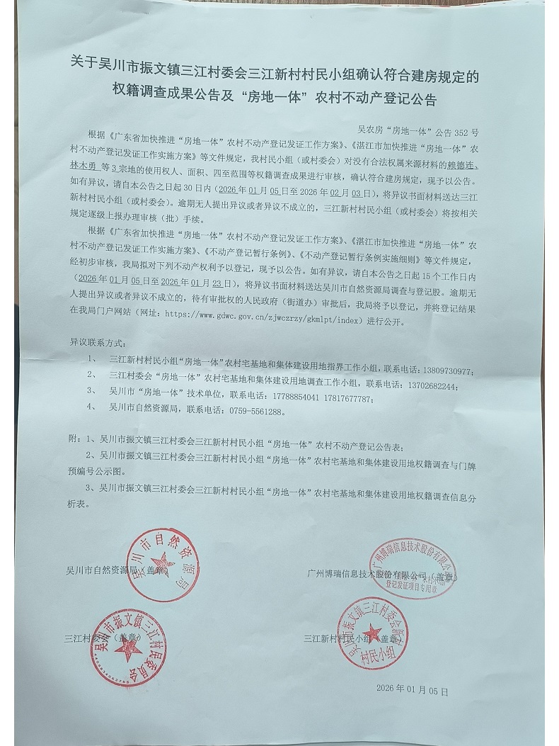 吴川市振文镇三江村委会三江新村村民小组确认符合建房规定的权籍调查成果公告及“房地一体”农村不动产登记公告