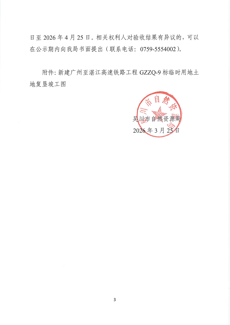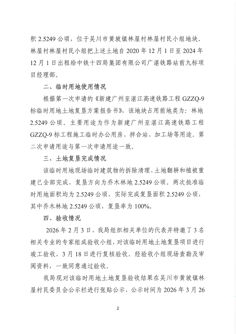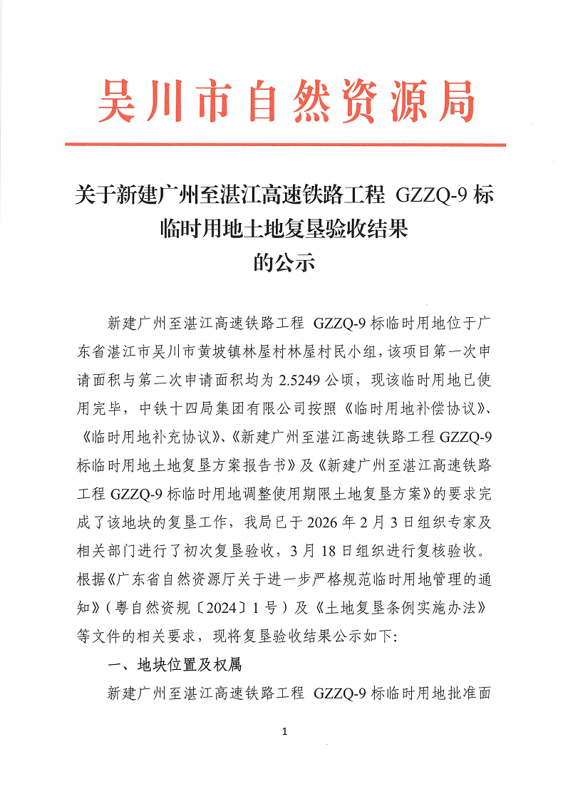 关于新建广州至湛江高速铁路工程 GZZQ-9标临时用地土地复垦验收结果的公示