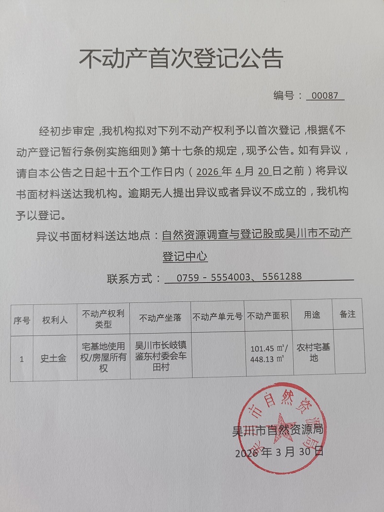 不动产首次登记公告(史士金)宗地面积:101.45平方米、建筑面积:448.13平方米