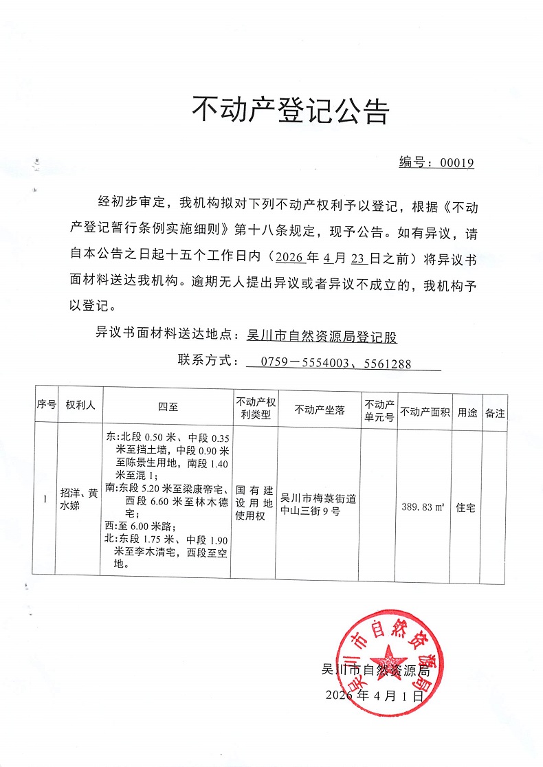 不动产登记公告(招洋、黄水娣)