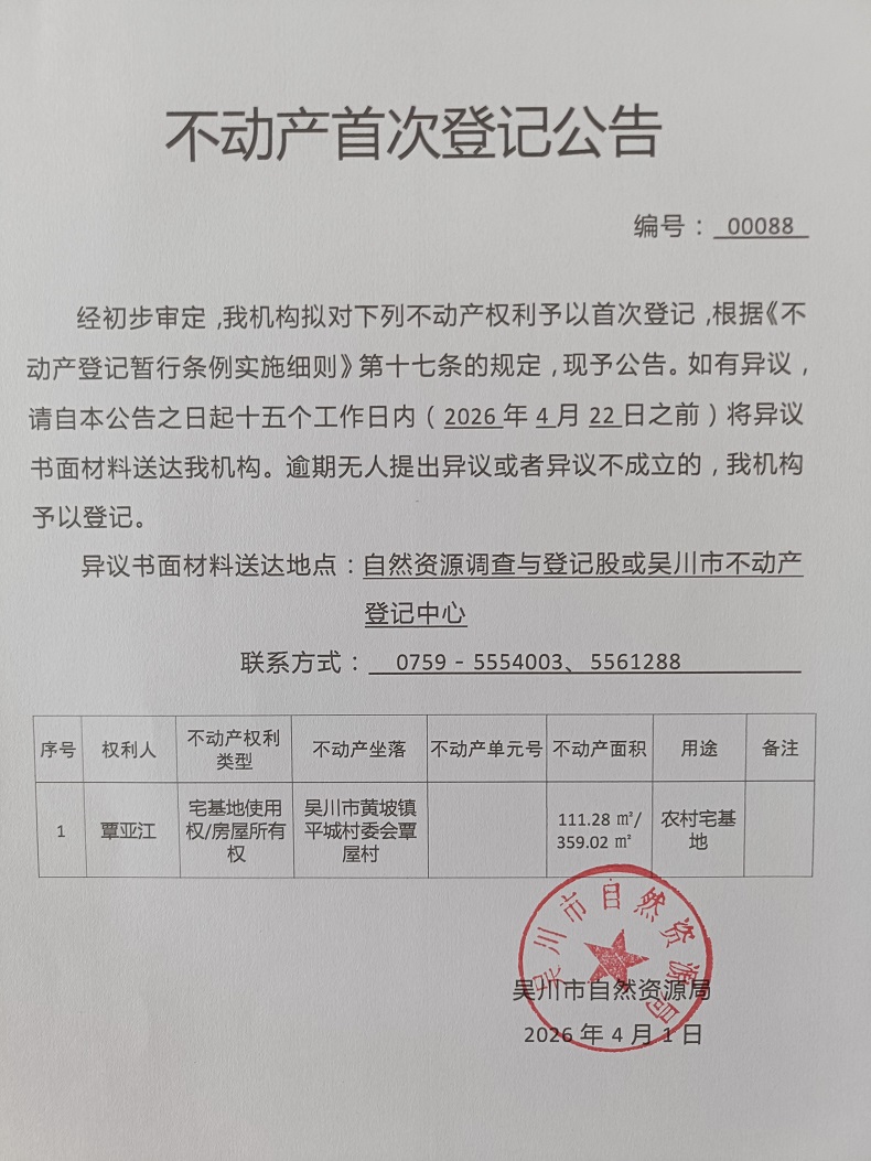 不动产首次登记公告(覃亚江)宗地面积:111.28平方米、建筑面积:359.02平方米