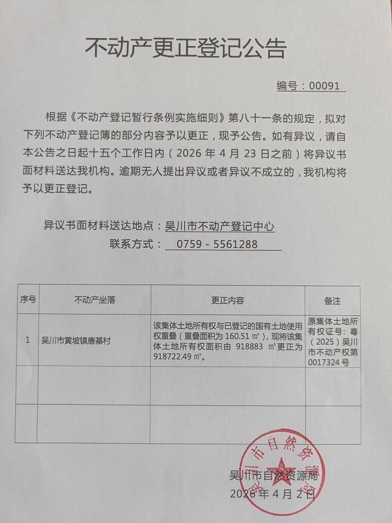 不动产更正登记公告(广东省吴川市黄坡镇唐基村唐基经济合作社)宗地面积:918722.49平方米
