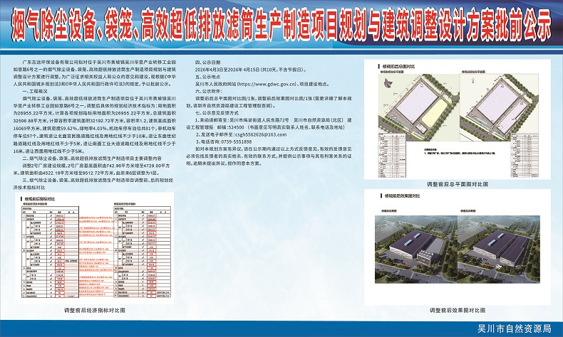 烟气除尘设备、袋笼、高效超低排放滤筒生产制造项目规划与建筑调整设计方案批前公示