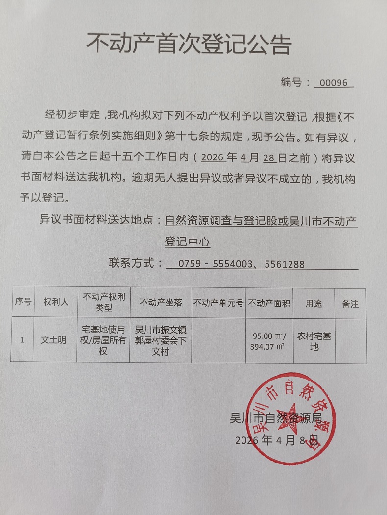 不动产首次登记公告(文土明)宗地面积:95.00平方米、建筑面积:394.07平方米