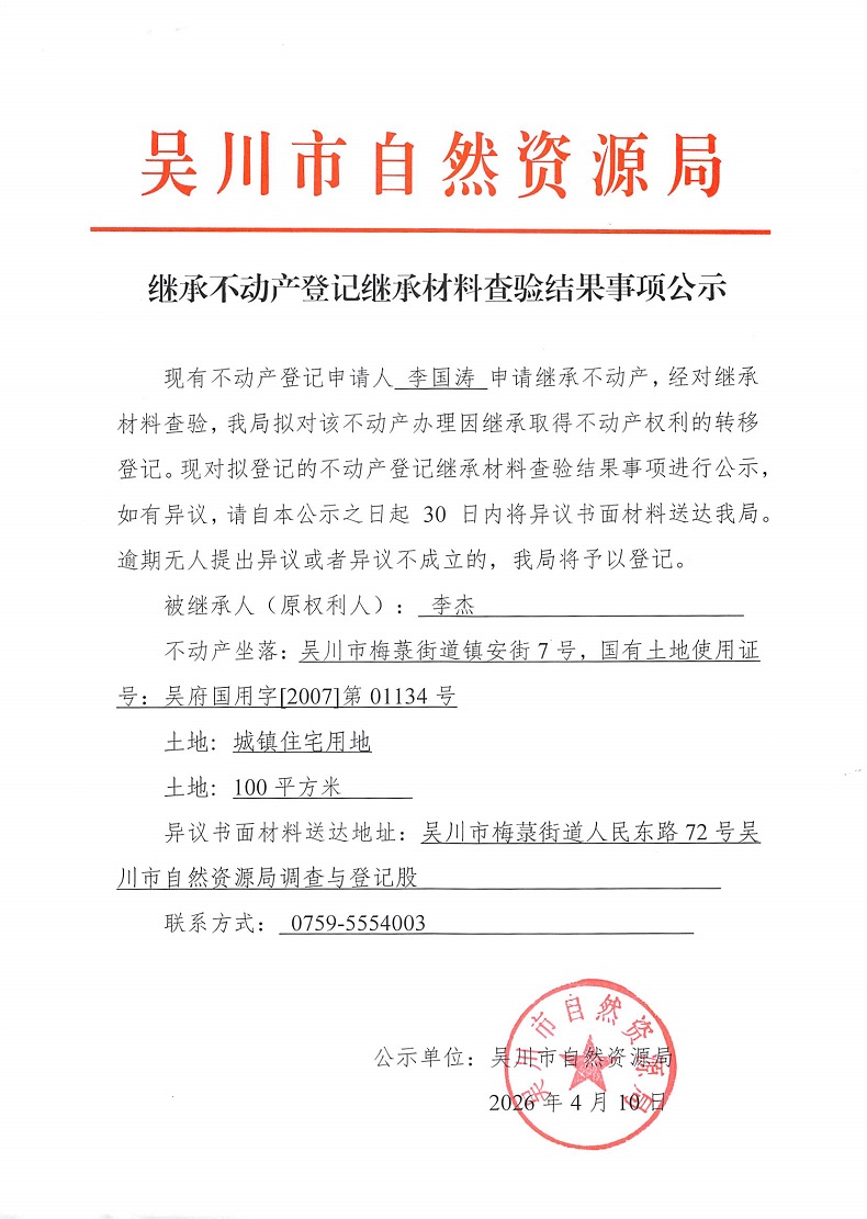 继承不动产登记继承材料查验结果事项公示(李杰)