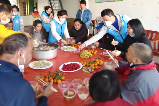 不久,伴随着雾腾腾的蒸汽,姜饭出锅,饺子出笼,志愿者为康园中心的众人送上丰盛的午宴,人们吃着姜饭,喝着鸡汤,夹几只饺子,其乐融融。