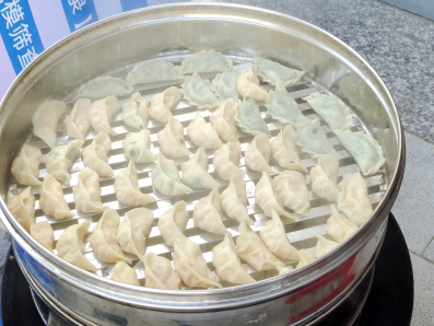 另一旁,在社工和志愿者的默契配合下,馅料调制完成,围坐大厅的志愿者们纷纷献艺,把调制的馅料包入饺子皮,精心地捏出各式各样的褶子,在众人的欢声交谈中,一笼笼饺子被放上蒸炉。