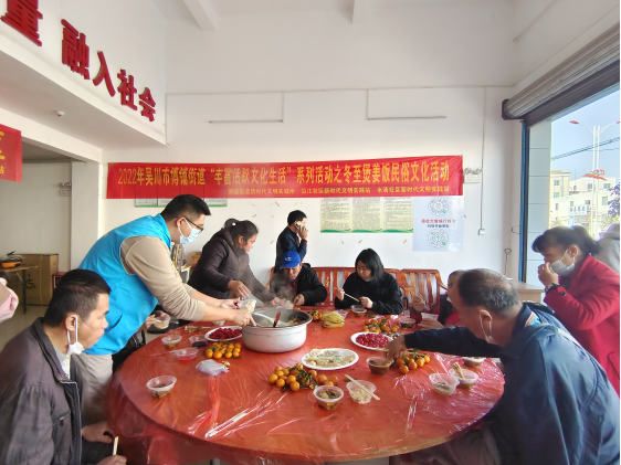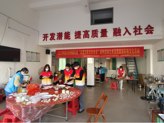 12月22日,博铺街道新时代文明实践所牵头,联合博铺街道社会工作站、沿江社区新时代文明实践站、水清社区新时代文明实践站、吴川市智善志愿者协会,在博铺街道社区康园中心共同举办了冬至煲姜饭民俗文化活动,召集志愿者和热心居民,购买食材煲姜饭包饺子,为街道特殊群体和长者群体送上美味暖心的午宴。
