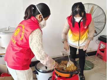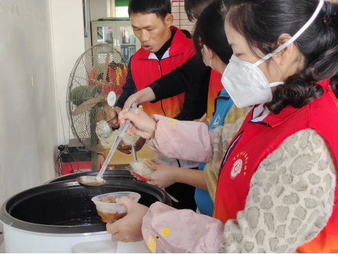 ▲上图为志愿者及街道工作人员为群众盛装姜饭、鸡汤