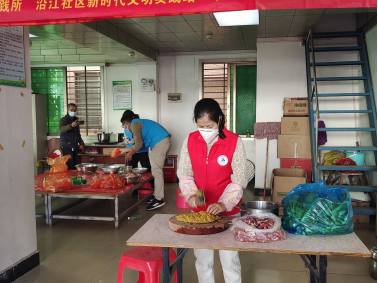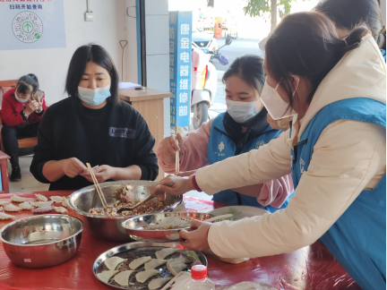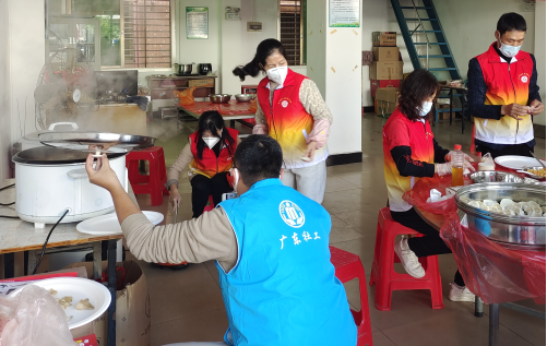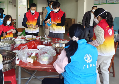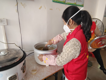 为了向康园中心的群众送上丰盛的冬至午宴,志愿者们分工合作,熬鸡汤、包饺子、煮姜饭……忙碌的身影让康园中心逐渐热闹了起来。