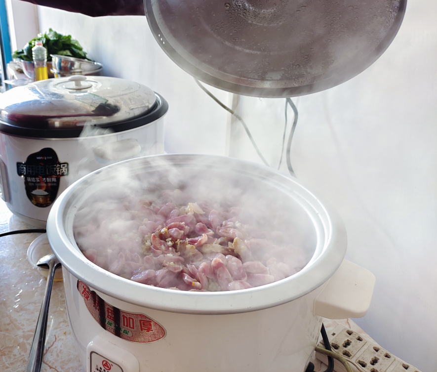 志愿者们将精选的食材放入锅中,加入药材熬制鸡汤,同时,康园中心大厅的志愿者开始剁制姜蓉,随着菜刀规律地起落,姜被切成碎末放入盆中,经过热油翻炒、下锅焖煮、放入腊味……姜饭的香气从锅盖的边缘偷偷地跑出,在康园中心渐渐弥漫开来。