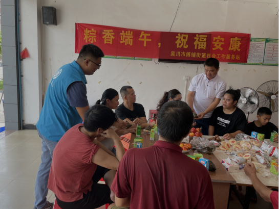 端午慰问显真情。坚持用心用情关怀特殊群体和长者群体,6月20日,博铺街道公共服务办联合博铺“双百”社工站、水清社区新时代文明实践站、吴川市鸿宝社会工作服务中心到博铺街道社区康园中心举行端午文化活动,为康园中心群众送上粽子70余个,消暑饮料5箱。社工和志愿者们还精心准备了水果、零食,组织端午历史文化故事分享和趣味问答,和社区康园中心居民群众谈心交流,送上节日问候。