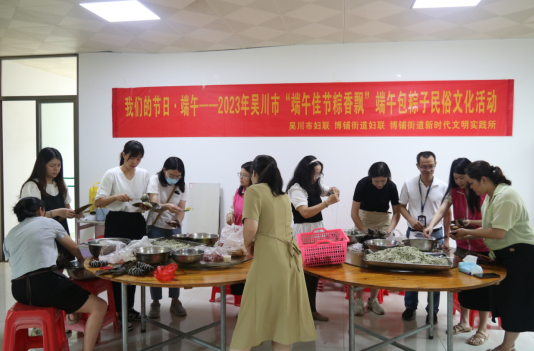 端午佳节粽香飘。坚持实施干部素质提升行动,积极引导干部职工争当优秀传统文化的传承者和发扬者,传承端午习俗,发扬端午文化,博铺街道妇联联合街道机关工会,组织开展端午包粽子民俗文化活动,组织干部职工从调制五花肉馅料、浸泡糯米、粽叶等前期准备开始学习如何包粽子。来自不同城市的职工向大家分享端午粽子不同的做法,馅料选择搭配的差异、粽子的外观形状的不同,激起对端午文化的浓厚兴趣。不同地域的文化习俗相融合,裹入粽叶,绑上棕绳,一个个粽子既是文化传承的载体,又是传统文化发扬的成果。