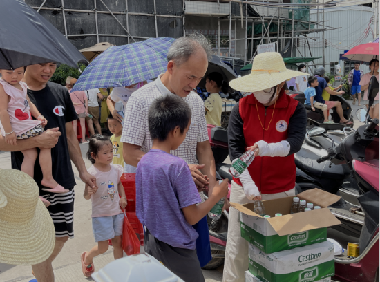 ▲博铺街道新时代文明实践志愿者为观赛群众送上饮用水