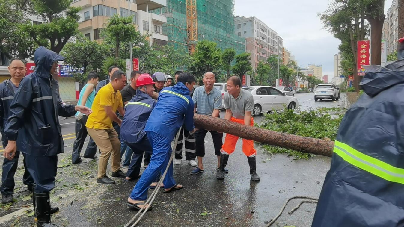 (图为市城综局局长黄福杰带领抢险队员扶正海港大道倒伏隔离带)