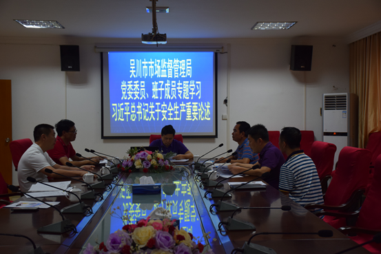 6月8日,吴川市市场监督管理局党委委员、班子成员召开安全生产专题会议,学习习近平总书记关于安全生产重要论述,学习马兴瑞省长在全国安全生产电视电话会议上的发言,学习马兴瑞省长在全省第二季度防范重特大生产安全事故暨消防工作电视电话会议的讲话,专题学习习近平总书记和李克强总理对四川西昌市经久乡森林火灾作出重要指示批示,专题研判全系统安全生产工作方案。