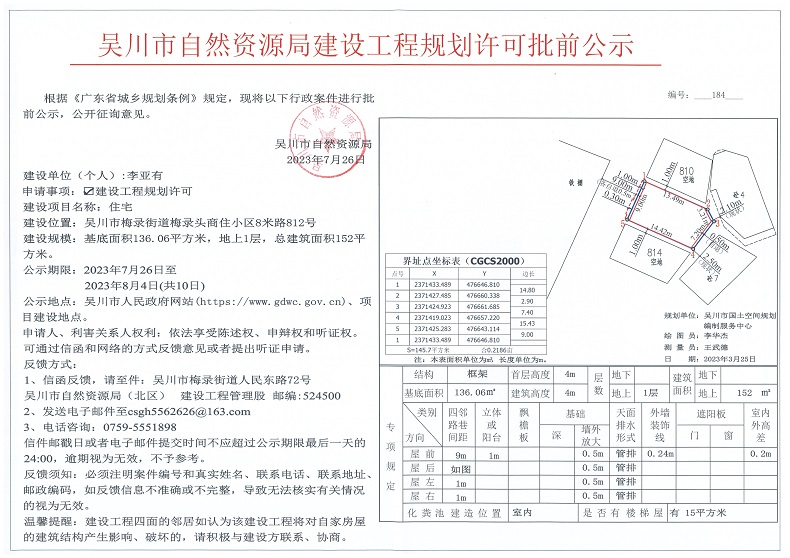吴川市自然资源局建设工程规划许可批前公示(李亚有812号)