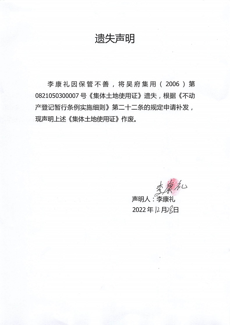 遗失声明(李康礼)