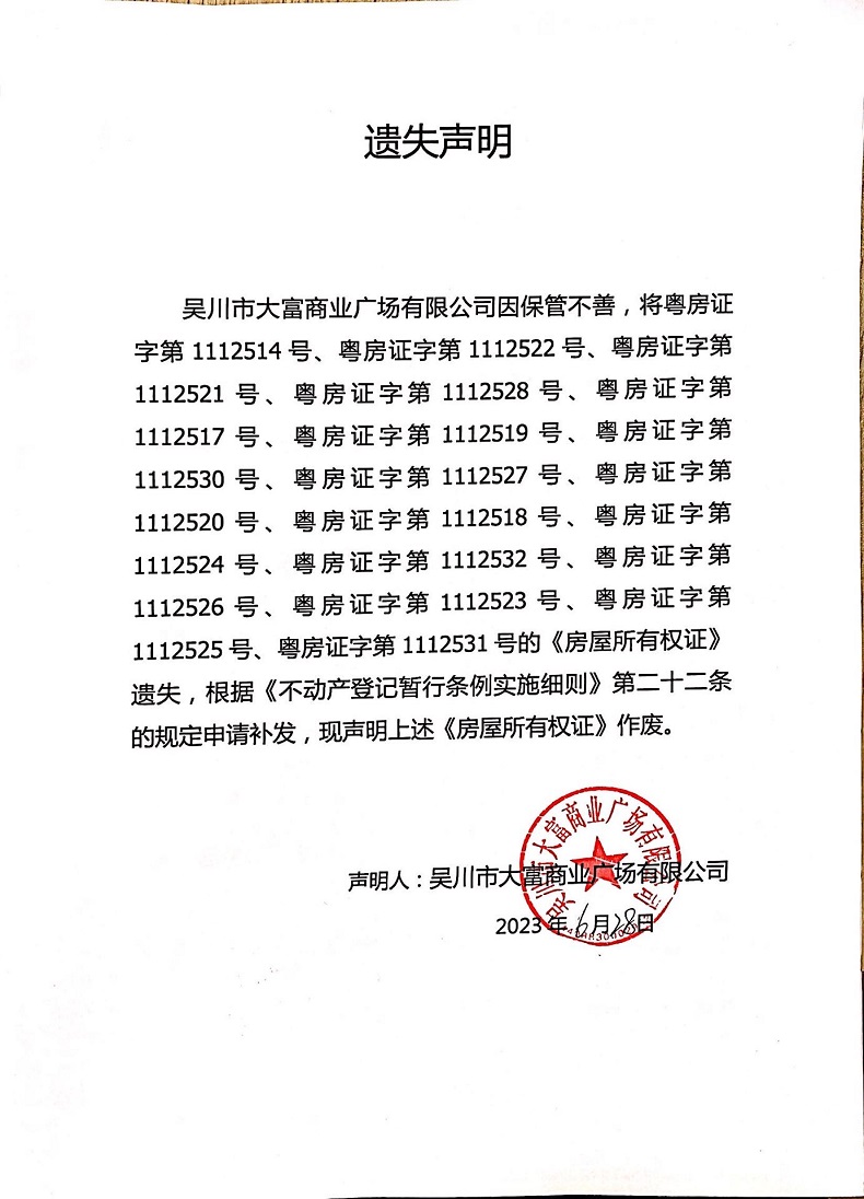 遗失声明(吴川市大富商业广场有限公司)