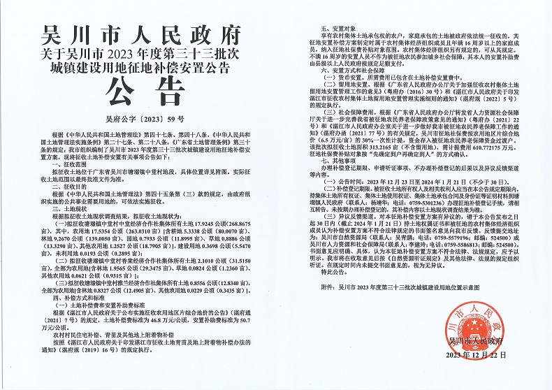 吴川市人民政府关于吴川市2023年度第三十三批次城镇建设用地征地补偿安置公告