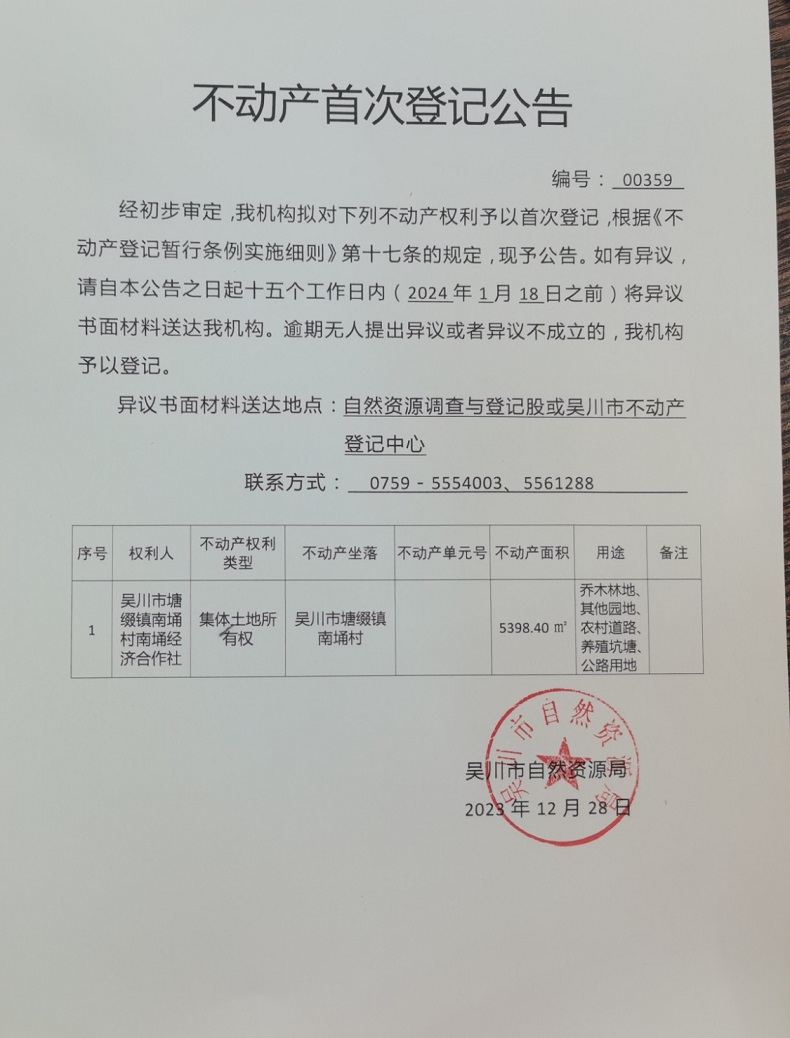 不动产首次登记公告(吴川市塘缀镇南埇村南埇经济合作社)5398.40