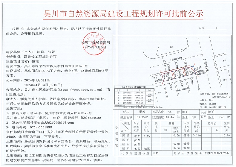 吴川市自然资源局建设工程规划许可批前公示(陈峰、张妮378)