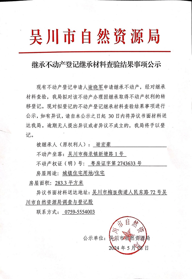 继承不动产登记继承材料查验结果事项公示(谢宏豪)