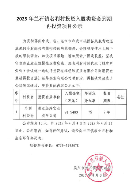 2025年兰石镇名利村投资入股类资金到期再投资项目公示