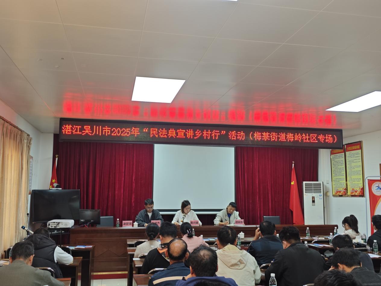为深入推进法治宣传教育走深走实,切实提升基层群众法治意识和风险防范能力,2025年12月5日,吴川市委政法委、市法学会、梅菉街道在梅岭社区联合开展湛江市吴川市2025年“民法典宣讲乡村行”暨《反有组织犯罪法》宣传活动,为社区居民送上“家门口的法治服务”。吴川市委政法委副书记、湛江市法学会理事黄兴娣出席活动,吴川市法学会工作人员、梅菉街道平安法治办负责同志及各社区干部代表、居民代表约100人参加。