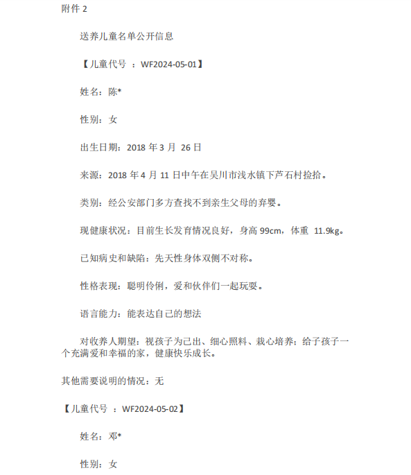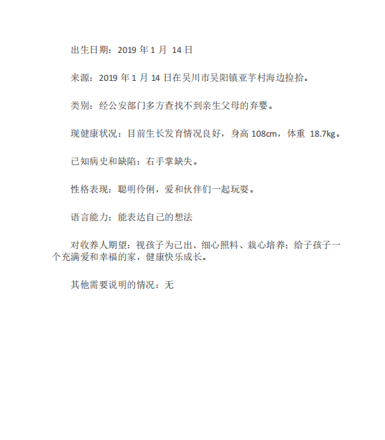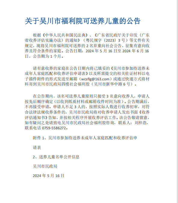 | 名称: | 吴川市福利院可送养儿童的公告 | ||
