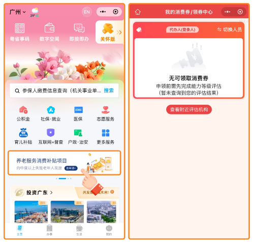 粤省事平台已接入“养老服务消费补贴项目”专区入口。进入粤省事App或微信小程序,首页点击“养老服务消费补贴项目”专区,即可跳转“民政通”小程序申领消费券。
