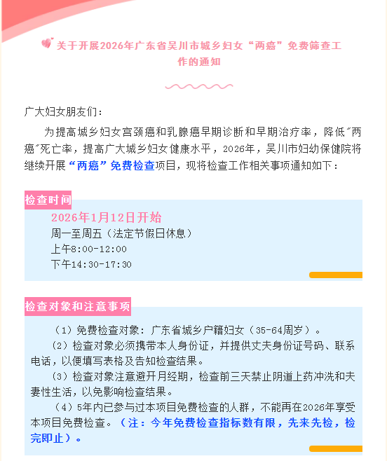 免费!吴川城乡妇女“两癌” 筛查工作1月12日开启